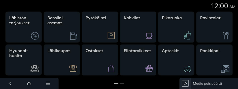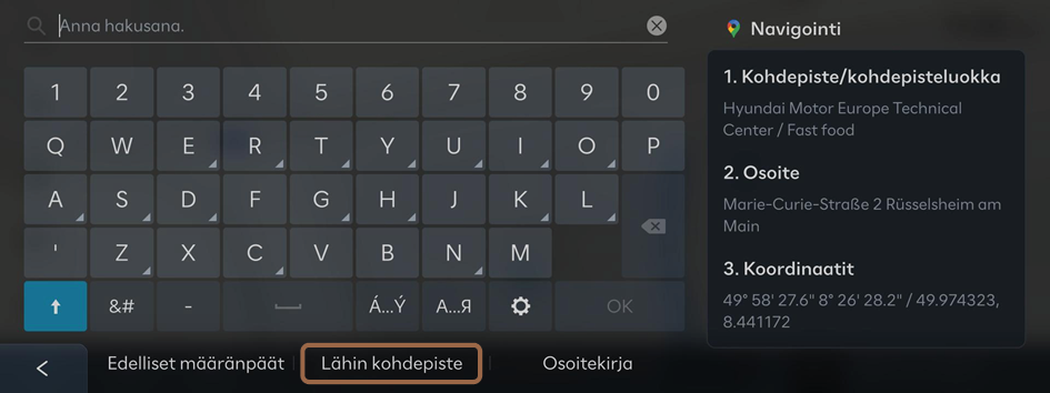 Jos haluat hakea manuaalisen syötön avulla opastuksen aikana karttanäytössä, paina ▶ Lähistön tiedot ▶ Lähin kohdepiste.