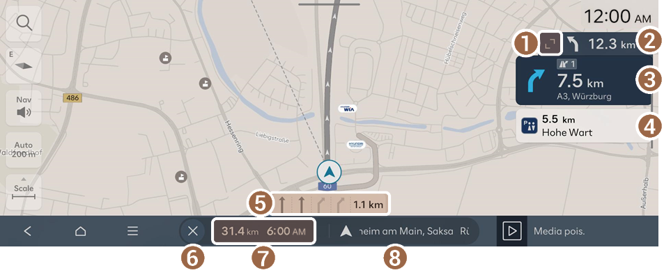 - Näyttää jäljellä olevan matkan kohteeseen ja arvioidun saapumisajan tai jäljellä olevan ajan kohteeseen. Saat lisätietoja painamalla tätä osaa.