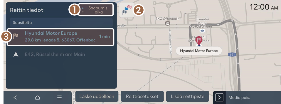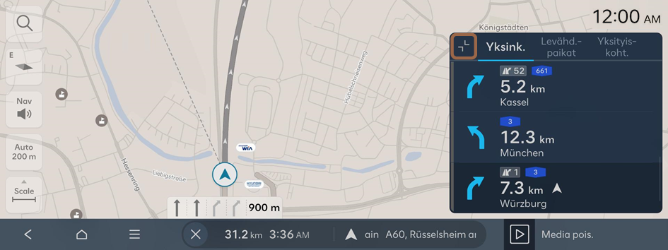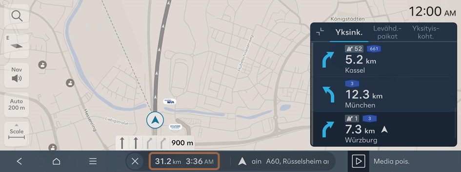 Voit tarkastella reittitietoja painamalla navigointinäytön osiota, jossa näkyy jäljellä oleva matka ja arvioitu saapumisaika.