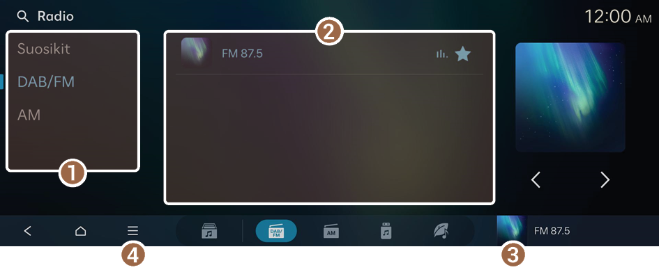 - • Selaa DAB/FM-as. tai Selaa FM-asemia: Valitse haluamasi asema, kun olet kuunnellut lyhyesti eri radioasemilta tulevia lähetyksiä (jos varusteena).