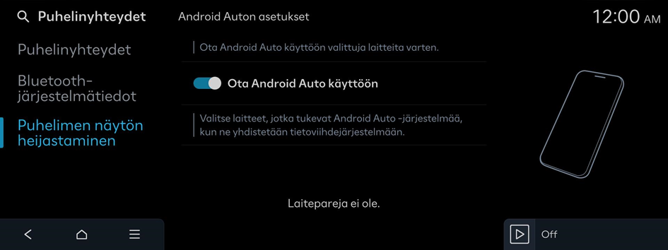 - Paina aloitusnäytössä Asetukset ▶ Puhelin-yhteydet ▶ Puhelimen näytön heijastaminen ▶ Android Auton asetukset ja suorita sitten Ota Android Auto käyttöön.