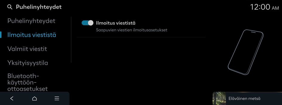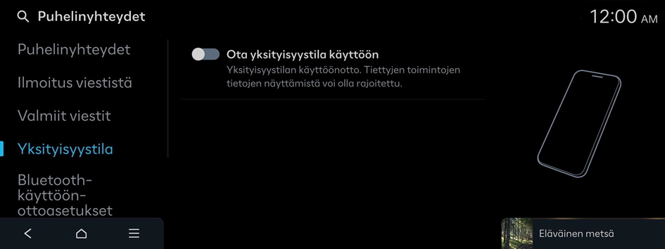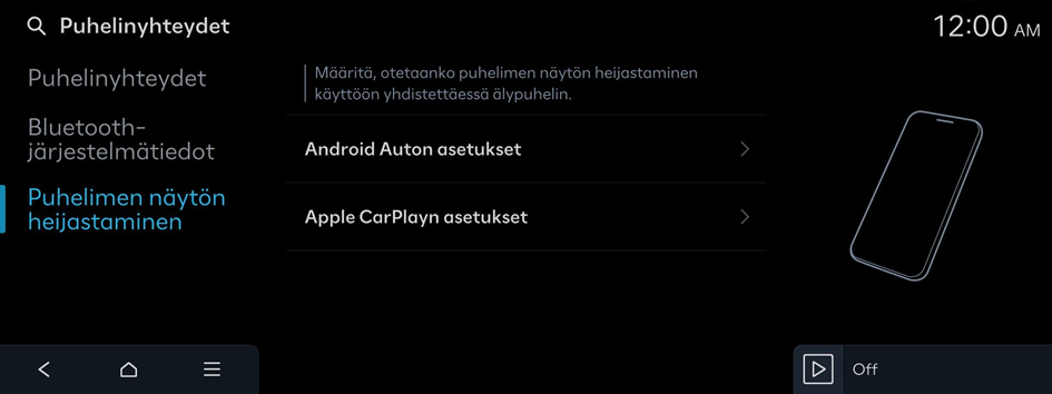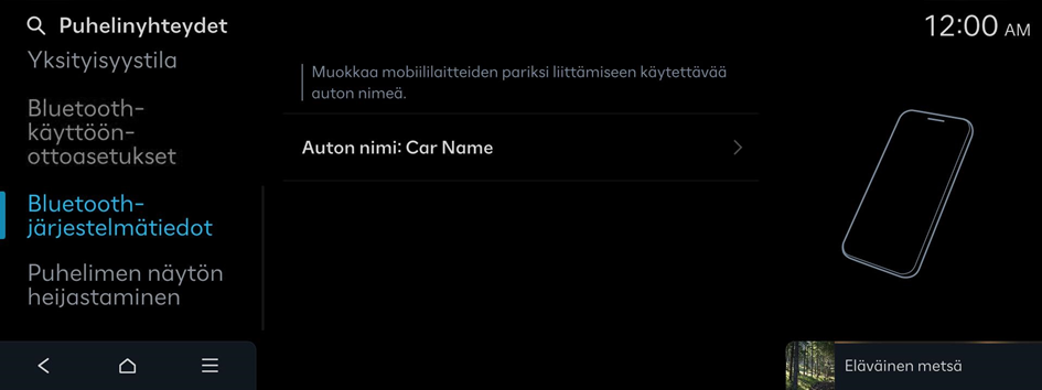 Hallitse Bluetooth-laitteita tai määritä niiden toiminta-asetukset. Voit myös ottaa käyttöön puhelimen heijastuksen, jotta voit ohjata älypuhelinsovellusta järjestelmän näytöstä sen jälkeen, kun olet yhdistänyt älypuhelimen järjestelmään.