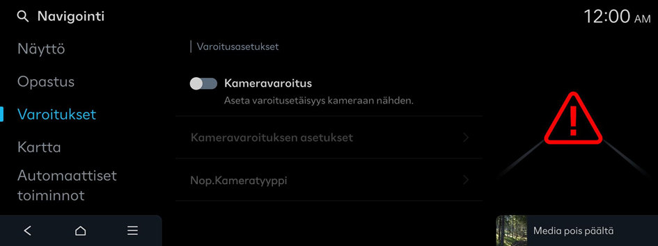 - • Varoitusetäisyys nopeusrajoituksen mukaan: Muuta kamerahälytyksen etäisyyttä automaattisesti nopeusrajoituksen mukaan. Kun Varoitusetäisyys nopeusrajoituksen mukaan -toiminto on pois päältä, on mahdollista valita aika, jolloin järjestelmä antaa liikennevalvontakameroita koskevia ohjeita vaihtoehdoissa Varoitusetäisyys (yleinen) ja Varoitusetäisyys (moottoritie).