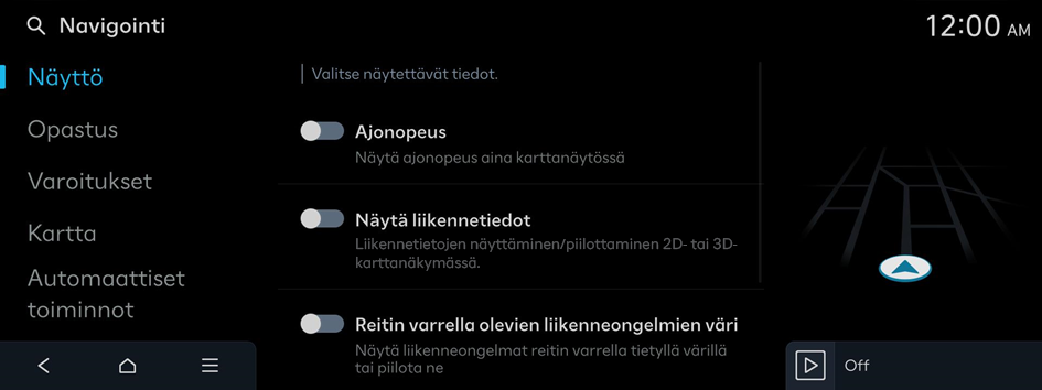 Voit määrittää navigointitoiminnot, näytön, puheopastuksen ja muita asetuksia.