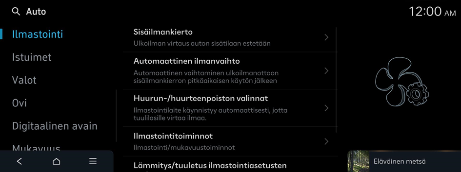 - Käytettävissä olevat asetukset voivat vaihdella auton mallin ja teknisten tietojen mukaan. Katso lisätietoja toiminnoista auton käyttöoppaasta.