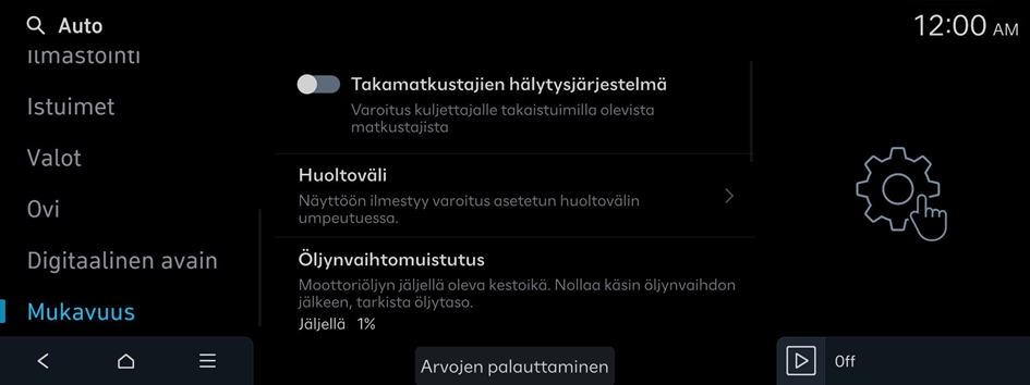 - Auton asetuksia voidaan muuttaa vain, kun auto on kytketty päälle.