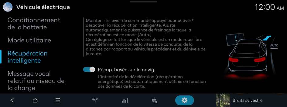 Ajuste automatiquement la puissance de freinage lorsque la récupération est en mode [Auto.]. Ce réglage se fait lorsque le véhicule est en mode roue libre et est défini en fonction de la vitesse de conduite, de la distance par rapport au véhicule précédent et du dénivelé de la route.