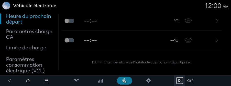 Vous pouvez configurer diverses fonctions telles que la charge automatique de la batterie ou la climatisation en fonction de l'heure de départ spécifiée.