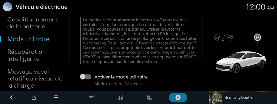 Le mode utilitaire se sert de la batterie VE pour fournir certaines fonctions alors que le contact du véhicule est coupé. Vous pouvez ainsi, par ex., utiliser le système d'infodivertissement, la climatisation ou l'éclairage de l'habitacle pendant un arrêt prolongé ou lorsque vous faites du camping.