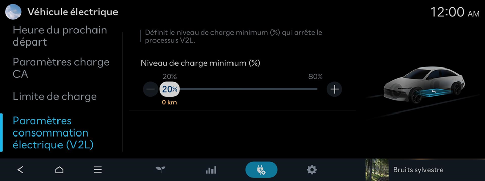 Définit le niveau de charge minimum (%) qui arrête le processus V2L.