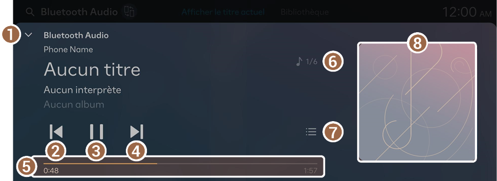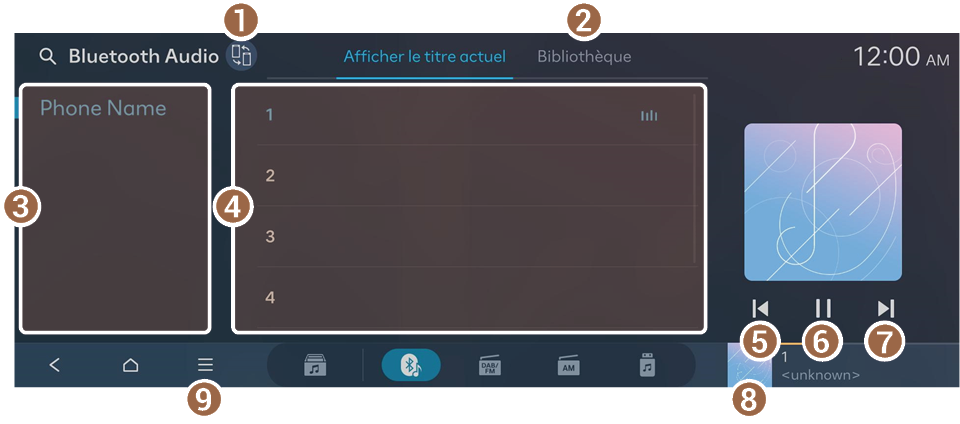 - Affiche l'écran du lecteur audio Bluetooth.