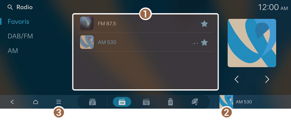 . - • Vous pouvez enregistrer toutes les stations, accessibles depuis l'écran AM, dans la liste des favoris. Sur l'écran AM, appuyez sur