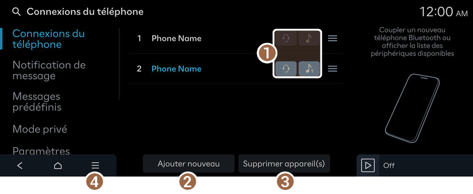 - L'accès aux données peut être activé ou désactivé à l'aide du menu Paramètres Bluetooth du téléphone mobile. Consultez le manuel de l'utilisateur du téléphone portable.