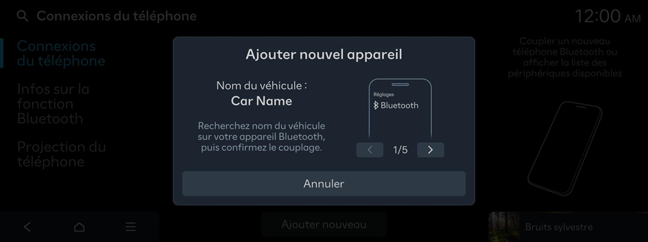 - Activez le Bluetooth de l'appareil Bluetooth à connecter et sélectionnez le système du véhicule dans la liste des appareils recherchés.