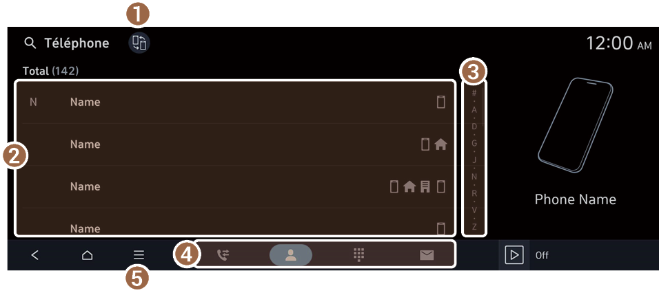 - Lorsqu'un autre téléphone mobile est connecté, l'écran n'affiche pas les contacts téléchargés du téléphone précédent, mais ils sont conservés dans le système jusqu'à ce que le téléphone soit supprimé de la liste.