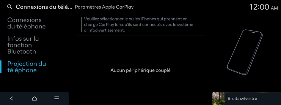 - Sur l'écran d'accueil, appuyez sur Réglages ▶ Connexions du téléphone ▶ Projection du téléphone ▶ Paramètres Apple CarPlay.
