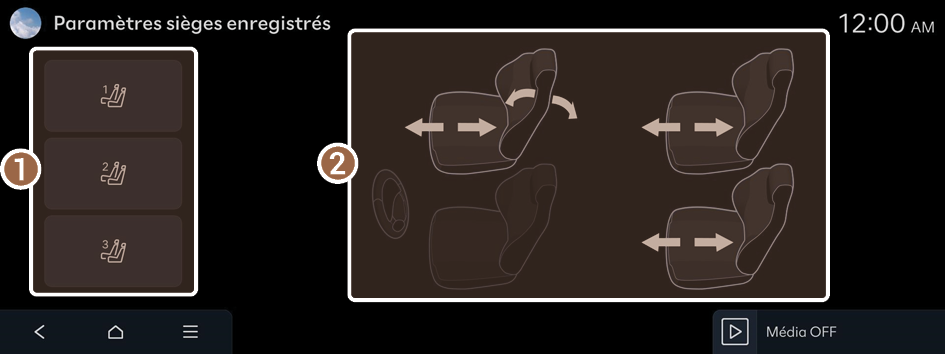 - Les sièges peuvent être déplacés vers une position enregistrée en sélectionnant un mode enregistré.