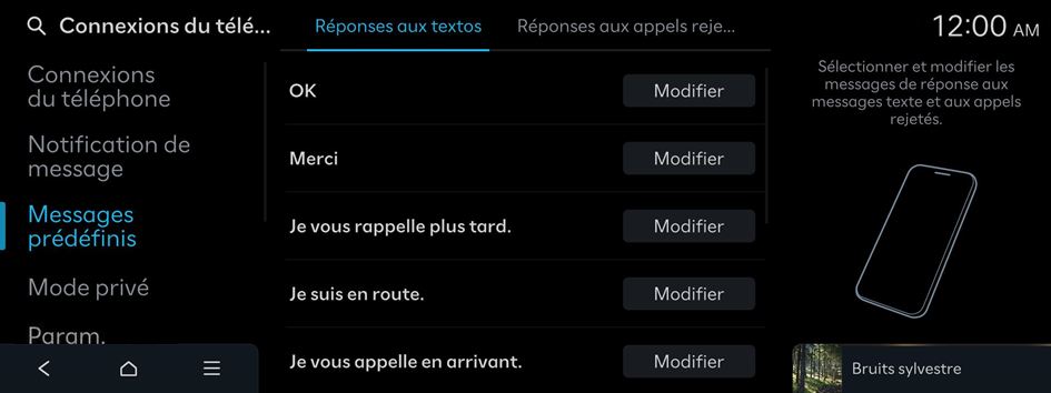 Sélectionner et modifier les messages de réponse aux messages texte et aux appels rejetés.