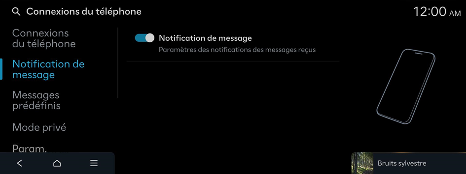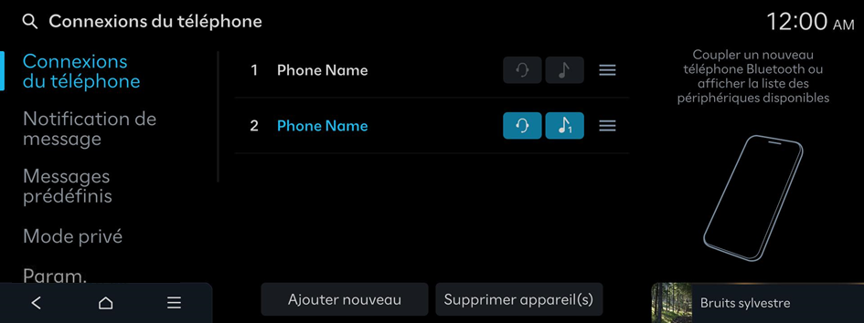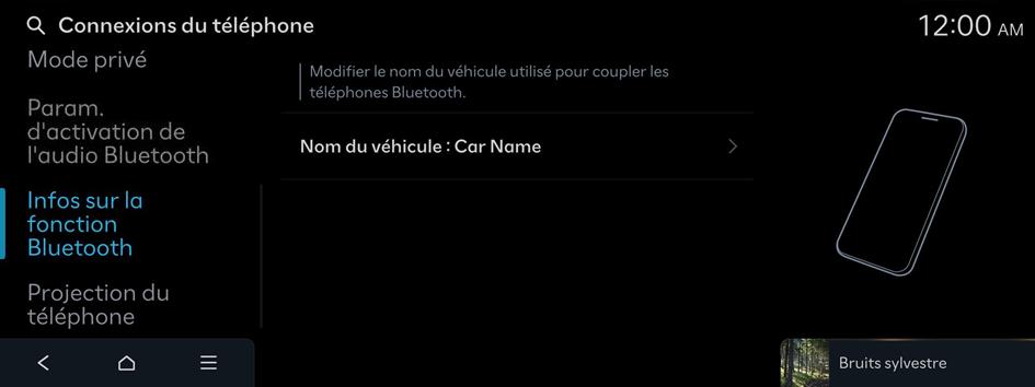 Gérez les dispositifs Bluetooth ou configurez leurs paramètres d'utilisation. Vous pouvez aussi activer la projection du téléphone de façon à contrôler l'application du smartphone depuis l'écran du système après avoir connecté le smartphone au système.