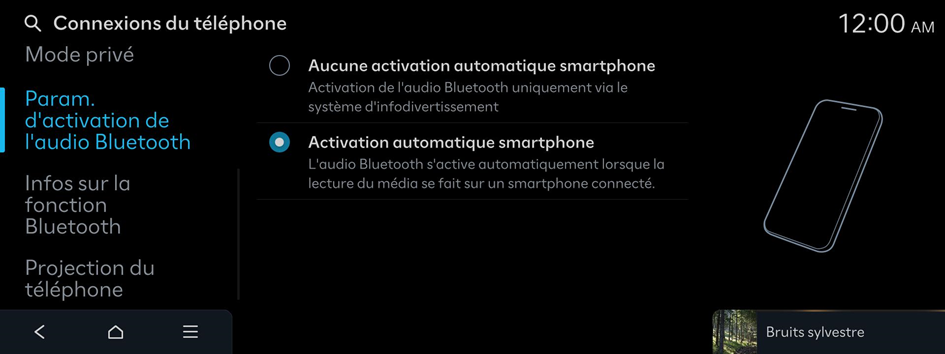 Démarre la lecture de l'audio Bluetooth lors de la lecture de médias sur votre téléphone. Vous pouvez également lire l'audio Bluetooth uniquement dans le véhicule.