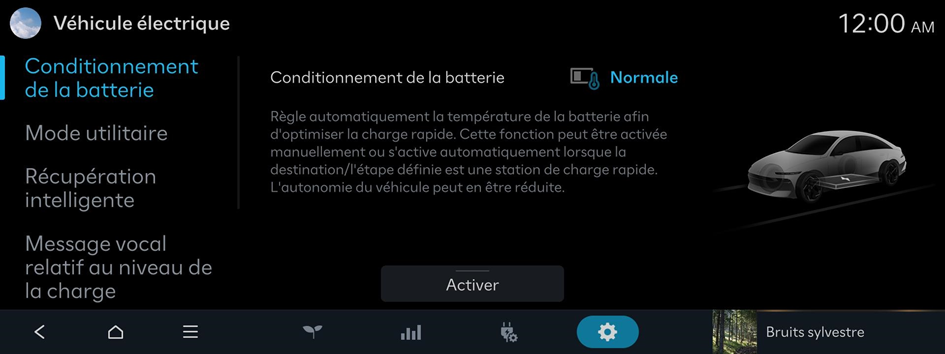dans l'écran ou sur le bouton du panneau de commande, saisissez un terme de recherche, puis sélectionnez l'élément à exécuter.Règle automatiquement la température de la batterie afin d'optimiser la charge rapide. Cette fonction peut être activée manuellement ou s'active automatiquement lorsque la destination/l'étape définie est une station de charge rapide. L'autonomie du véhicule peut en être réduite.