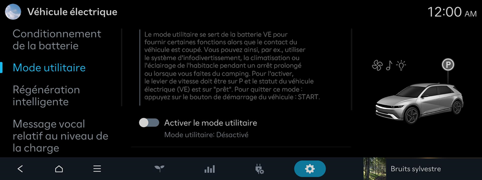 Le mode utilitaire se sert de la batterie VE pour fournir certaines fonctions alors que le contact du véhicule est coupé. Vous pouvez ainsi, par ex., utiliser le système d'infodivertissement, la climatisation ou l'éclairage de l'habitacle pendant un arrêt prolongé ou lorsque vous faites du camping.