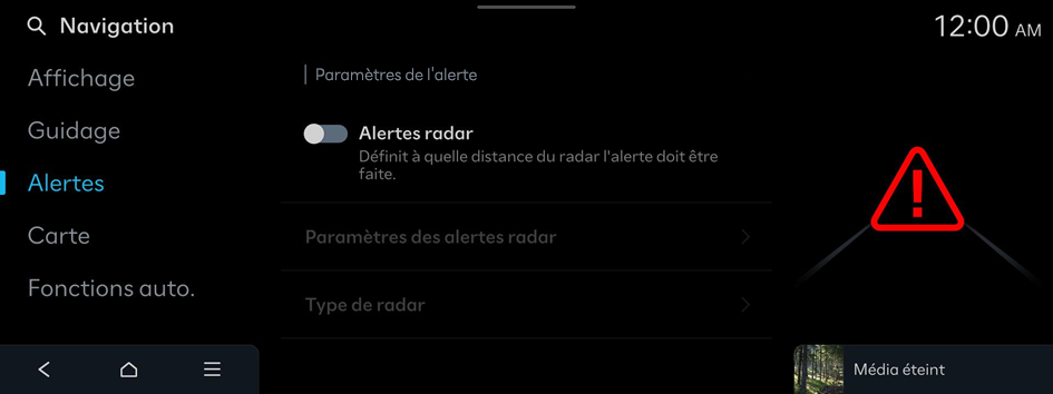 - • Distance des alertes selon la limitation de vitesse : modifie automatiquement la distance d'alerte de la caméra en fonction de la limite de vitesse. Lorsque la fonction Distance des alertes selon la limitation de vitesse est désactivée, il est possible de sélectionner le moment où recevoir des informations de guidage des caméras de surveillance du contrôle routier sur Distance des alertes (en général) et Distance de l'alerte (autoroute).