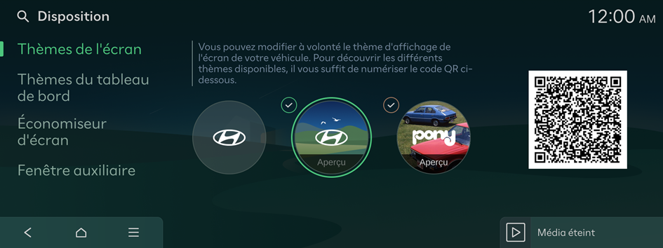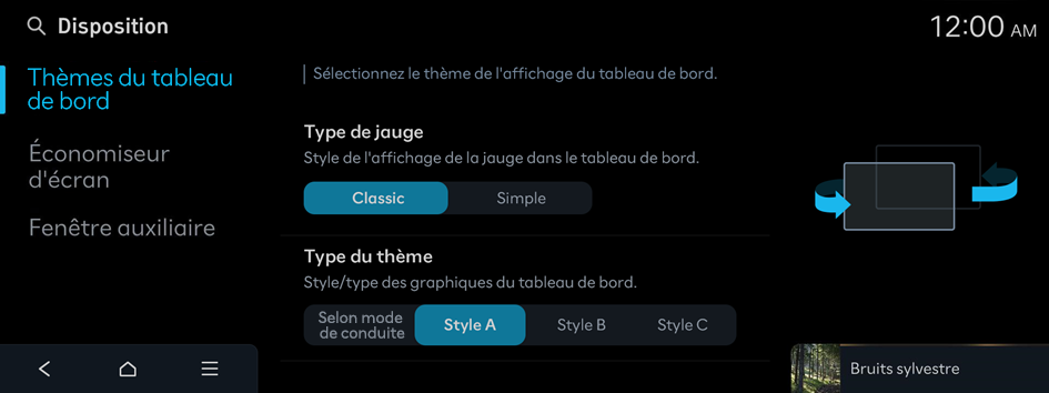 dans l'écran ou sur le bouton du panneau de commande, saisissez un terme de recherche, puis sélectionnez l'élément à exécuter.Vous pouvez modifier à volonté le thème d'affichage de l'écran de votre véhicule.