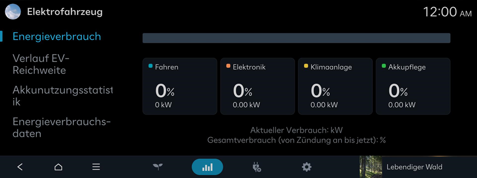 Sie können den Stromverbrauch des Antriebsstrangs, der Klimatisierung, der elektrischen Systeme und der Batteriepflegefunktion anzeigen.