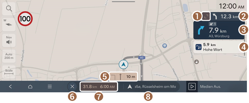 - Zeigt die verbleibende Entfernung zum Ziel und die geschätzte Ankunftszeit oder die verbleibende Zeit bis zum Ziel an. Um weitere Informationen anzuzeigen, tippen Sie auf diesen Bereich.