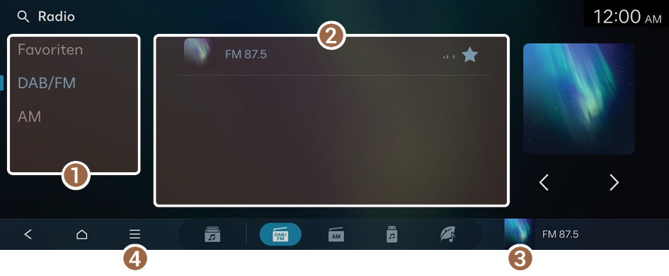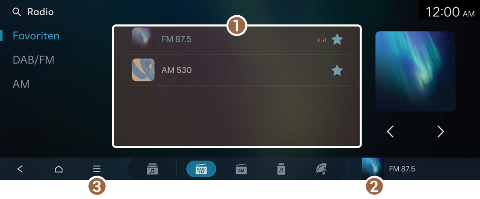 . - • Sie können alle Sender, auf die über den DAB/FM-Bildschirm zugegriffen werden kann, in der Favoritenliste speichern. Tippen Sie auf dem Bildschirm des DAB/FM auf