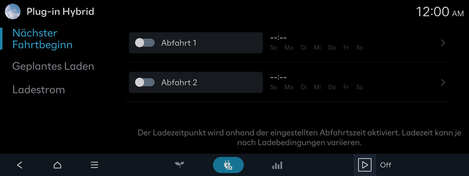 Sie können verschiedene Ladeeinstellungen wie die automatische Batterieladung entsprechend der angegebenen Abfahrtszeit konfigurieren.