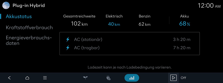 Der Plug-in Hybrid-Bildschirm bietet die folgenden Funktionen und Informationen: