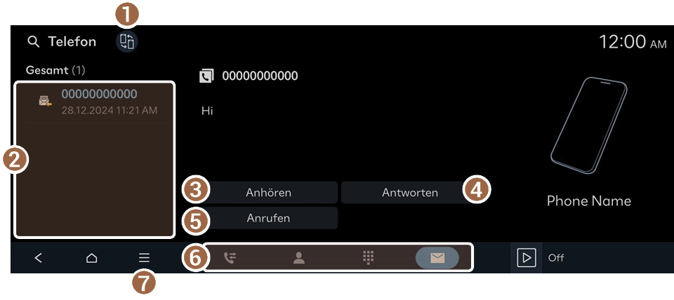 Der Bildschirm zeigt Informationen über den Absender oder seine Telefonnummer an, wenn ein über Bluetooth verbundenes Mobiltelefon eine Textnachricht empfängt. Sie können auch die im System gespeicherte kurze Antwortnachricht senden.