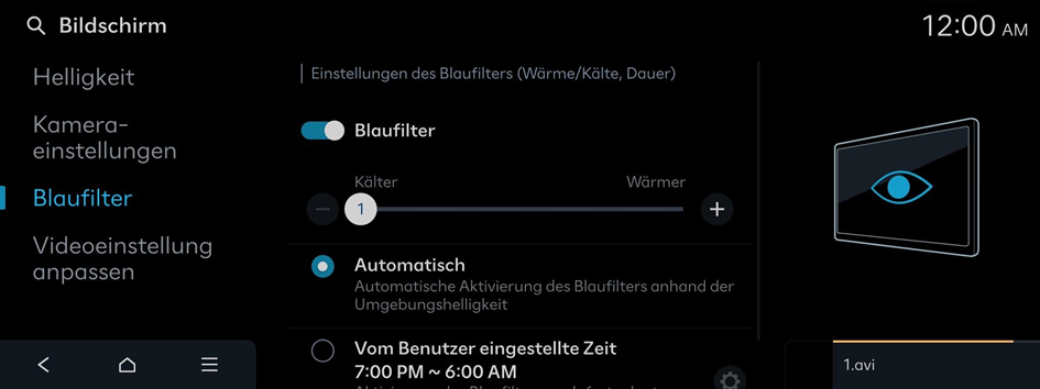 Einstellungen des Blaufilters (Wärme/Kälte, Dauer)