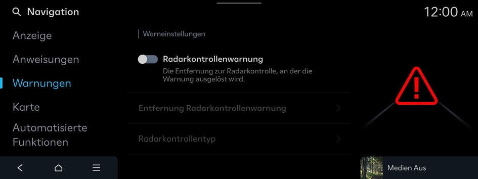 - • Warnzeitpunkt anhand Tempolimit: Ändern Sie automatisch den Abstand der Warnung vor Radarkameras in Abhängigkeit vom Tempolimit. Wenn die Funktion Warnzeitpunkt anhand Tempolimit deaktiviert ist, kann die Zeit ausgewählt werden, zu der die Warnung vor Radarkameras unter Warnzeitpunkt (Allgemein) und Warnzeitpunkt (Autobahn) ausgewählt werden kann.
