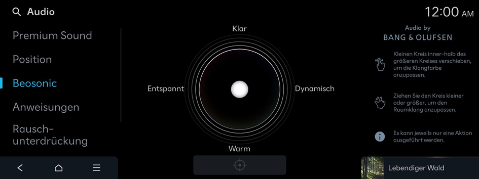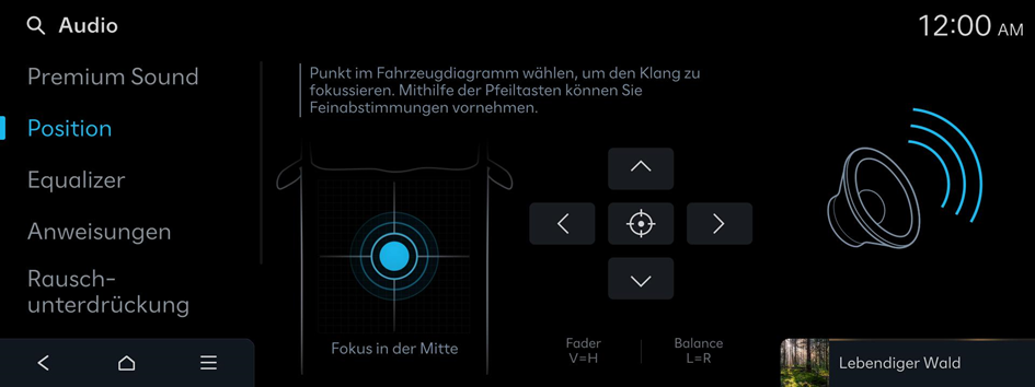 Punkt im Fahrzeugdiagramm wählen, um den Klang zu fokussieren. Mithilfe der Pfeiltasten können Sie Feinabstimmungen vornehmen.
