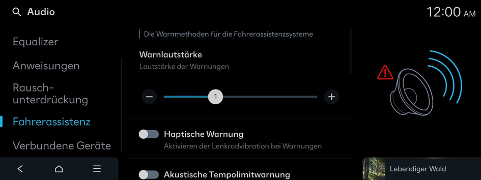 Aktivierung der akustischen Spursicherheitswarnung. Der Warnton kann nicht deaktiviert werden, wenn die haptische Warnung Aus ist.