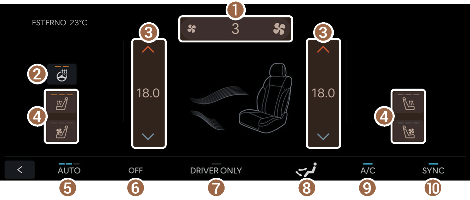 - Consente di attivare o disattivare la funzione che sincronizza la temperatura del sedile del guidatore e del passeggero.