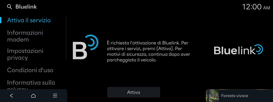 - Nella schermata home premere Impostazioni ▶ Bluelink ▶ Attiva il servizio.