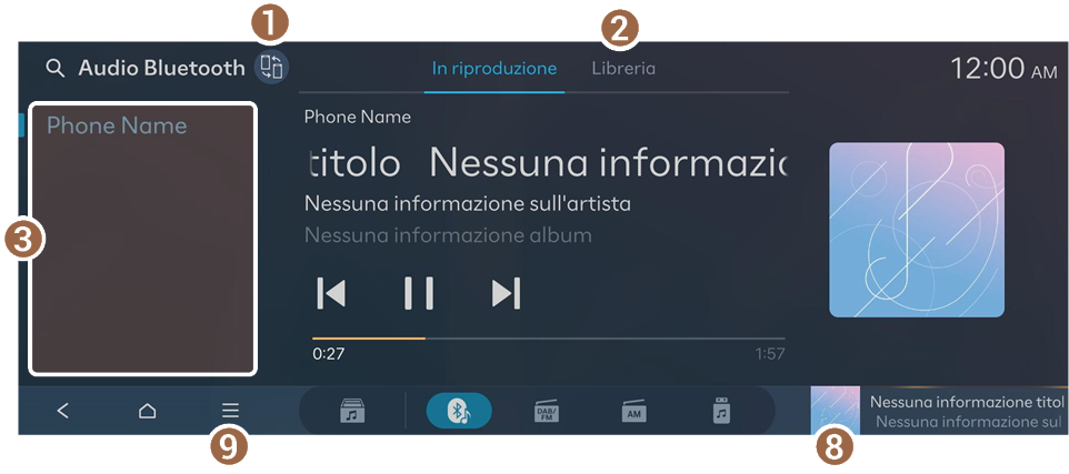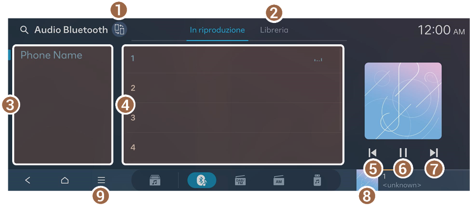 - I controlli o le schermate visualizzate possono variare a seconda del dispositivo Bluetooth connesso, del modello di telefono e dell'app lettore musicale.