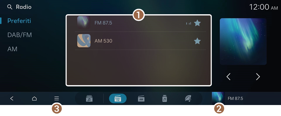 . - • È possibile salvare tutte le stazioni accessibili dalla schermata DAB/FM nell'elenco dei preferiti. Nella schermata DAB/FM, premere