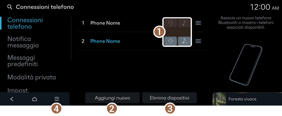 - Nella schermata home premere Impostazioni ▶ Connessioni telefono ▶ Connessioni telefono ▶ Elimina dispositivi.