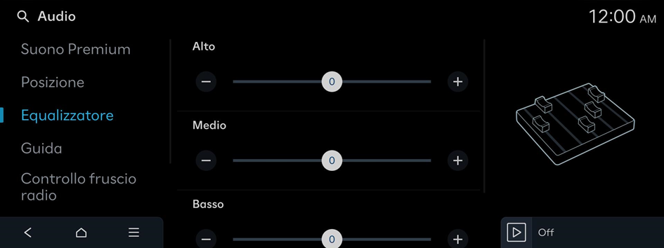 Regolare il suono modificando l'intensità (livello di uscita) per ogni banda audio: bassi, medi e alti.