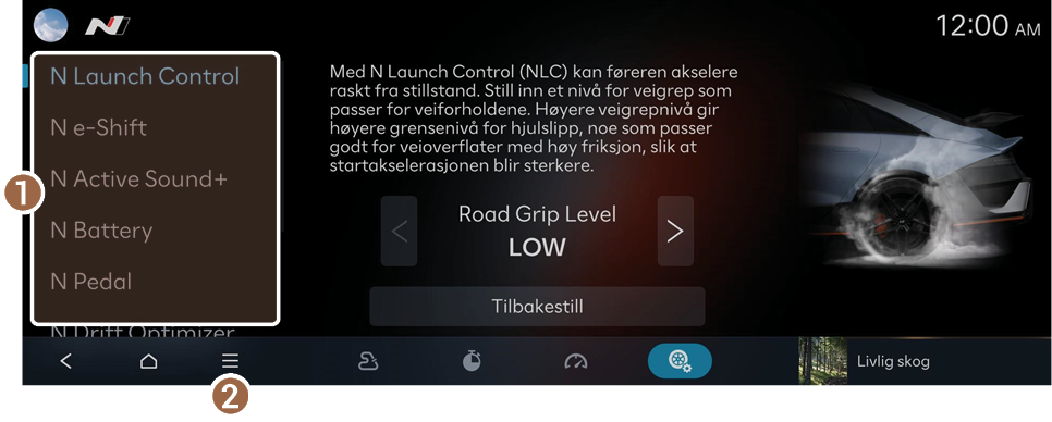 - • N Launch Control: Med N Launch Control (NLC) kan føreren akselere raskt fra stillstand. Still inn et nivå for veigrep som passer for veiforholdene. Høyere veigrepnivå gir høyere grensenivå for hjulslipp, noe som passer godt for veioverflater med høy friksjon, slik at startakselerasjonen blir sterkere.