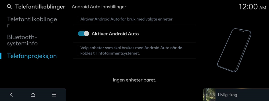 - På startskjermen trykker du på Innstillinger ▶ Telefon-tilkoblinger ▶ Telefonprojeksjon ▶ Android Auto innstillinger og aktiver deretter Aktiver Android Auto.