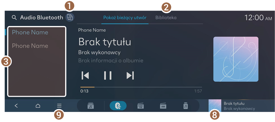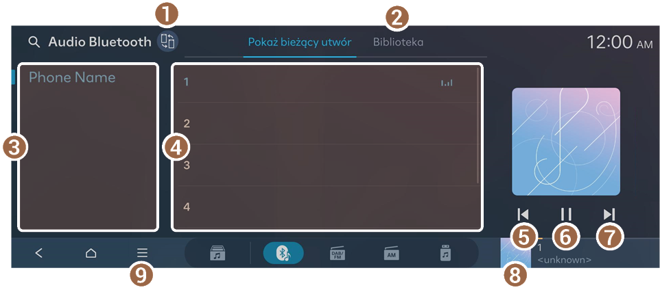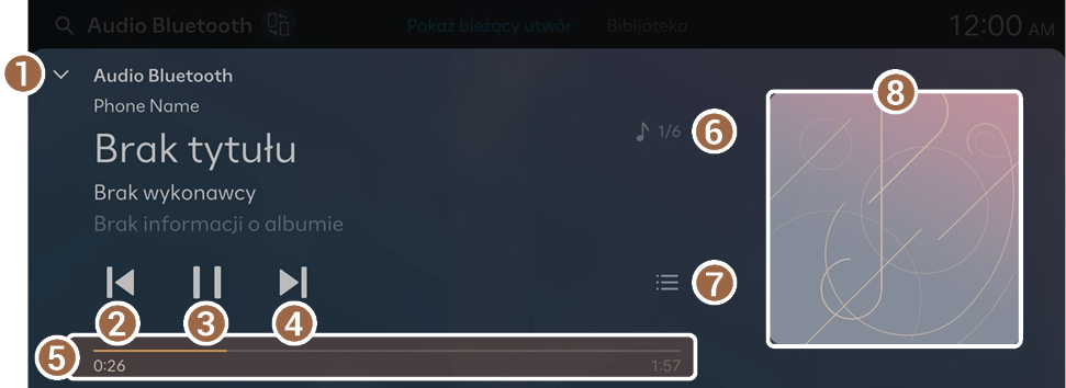 - Wyświetla ekran odtwarzacza audio Bluetooth.