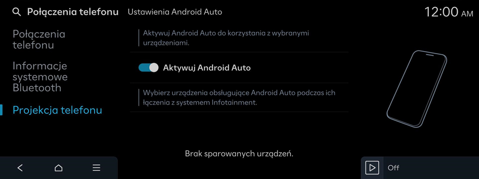 - Na ekranie głównym nacisnąć kolejno Ustawienia ▶ Połączenia telefonu ▶ Projekcja telefonu ▶ Ustawienia Android Auto, a następnie włączyć opcję Aktywuj Android Auto.