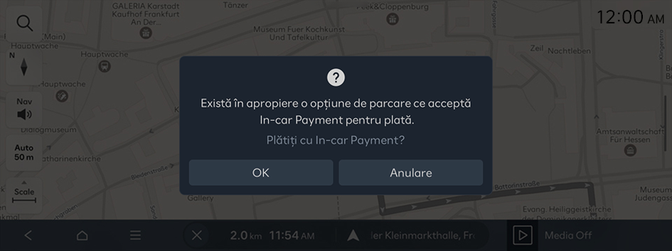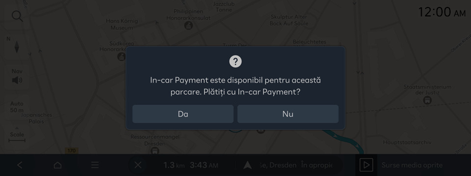 - • Selectați și setați ca destinație una dintre parcările afiliate In-car Payment afișate pe ecran. Imediat ce ajungeți la o parcare afiliată, se afișează fereastra de notificare de plată In-car Payment. Utilizați această fereastră pentru a accesa ecranul de plăți.