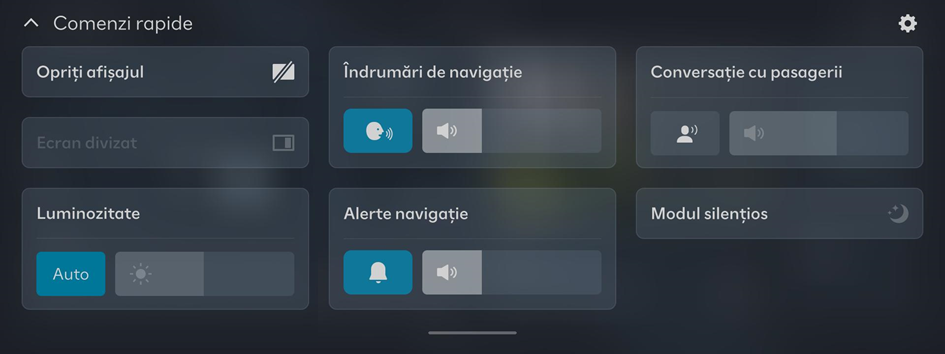 din nou din ecranul Control rapid. - Puteți utiliza modul de discuții cu pasagerii sau ajusta volumul sonorului din ecranul împărțit. Pe ecranul principal, apăsați Setări ▶ Layout ▶ Ecran divizat apoi activați Conversație cu pasagerii.